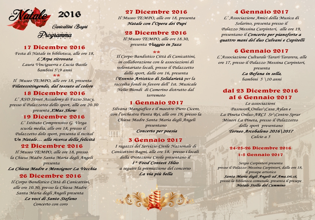 Con gli Auguri di Buone Feste a tutta la cittadinanza, da parte del Sindaco Paolo Amenta, dell’Amministrazione e del Consiglio comunale, è stato reso noto il programma delle manifestazioni e degli appuntamenti del Natale 2016 di Canicattini Bagni, approntato come sempre con la collaborazione delle vari realtà associative e sociali della città, gli artisti e i tanti cittadini che hanno messo a disposizione impegno e disponibilità in sinergia con l’Amministrazione.